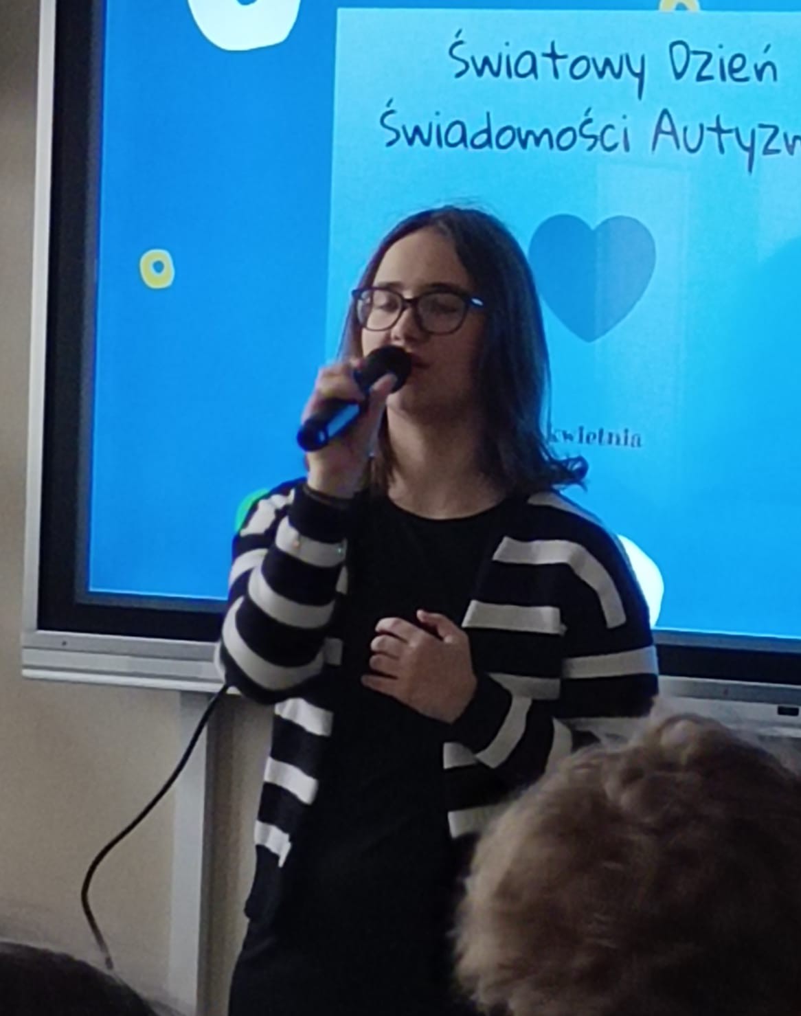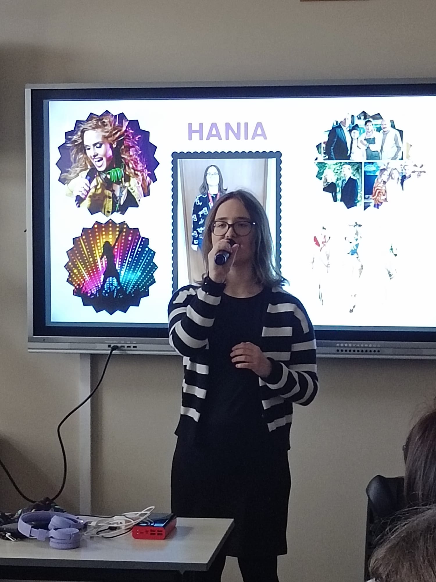 Hania G. z kl. I oczarowała publiczność emocjonującym wykonaniem utworów „I dream a dream” oraz „Hero”, które poruszyły wszystkich słuchaczy. Jej pasją jest śpiewanie, szczególnie w języku angielskim.